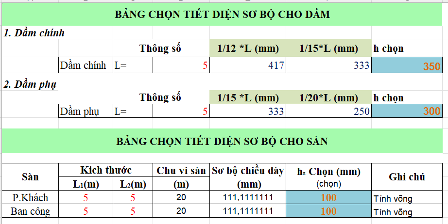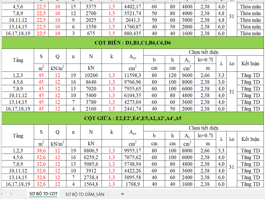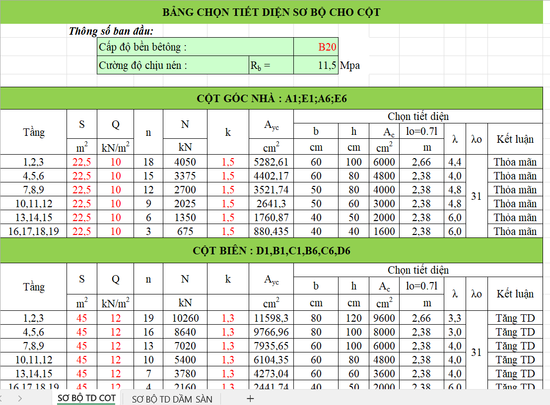 Bảng tính excel sơ bộ tiết diện cột dầm sàn